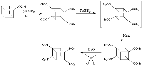 The introduction of a few nitro groups, as we have already seen (see Reactivity), is straightforward in certain cases. For example the transformation of cubanecarboxylic acids to the corresponding amines via Curtius rearrangement, followed by oxidation. This method fails for cubanes with adjacent carboxylic acid groups. Although the corresponding vicinal diamines can be made and are relatively stable compounds, ring cleavage reactions intervene during the oxidation to a 1,2-dinitrocubane. This destroys the cubane system entirely. This methodology has been used to prepare 1,3,5-trinitrocubane and 1,3,5,7-tetranitrocubane, shown below: