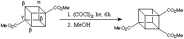 Indeed, the reaction of commercially available 1,4-dimethoxoycarbonylcubane with oxalyl chloride, (COCl)2, under irradiation from a sunlamp for 6 hours produced, after esterification with MeOh, 1,2,4-trimethoxycarbonylcubane in 72% yield. The scheme is given below: