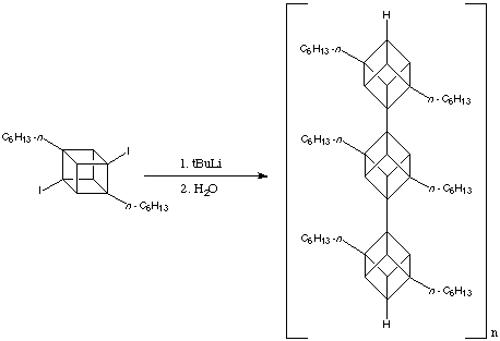 As the number of linked cubane units increases, that is, as n increases, the solubility of [n ]cubylcubanes plunges; at n = 3 most are essentially insoluble in ordinary solvents. This problem can be relieves by having moderately long alkyl substituents on the "monomer". Virtuani, a member of the Eaton research group has converted 2,7-di-n -hexyl-1,4-diiodocubane into the corresponding diyl, whose polymerisation, presumably initiated by addition of 4-iodo-1-lithio- or 2,7-di-n -hexyl-1,4-dilithio-cubane, gives an oligomeric cubylcubane with a molecular weight of approximately. This corresponds to a polycubyl rod about 150 Angstroms long containing on average 40 cubane units. The reaction is shown below: